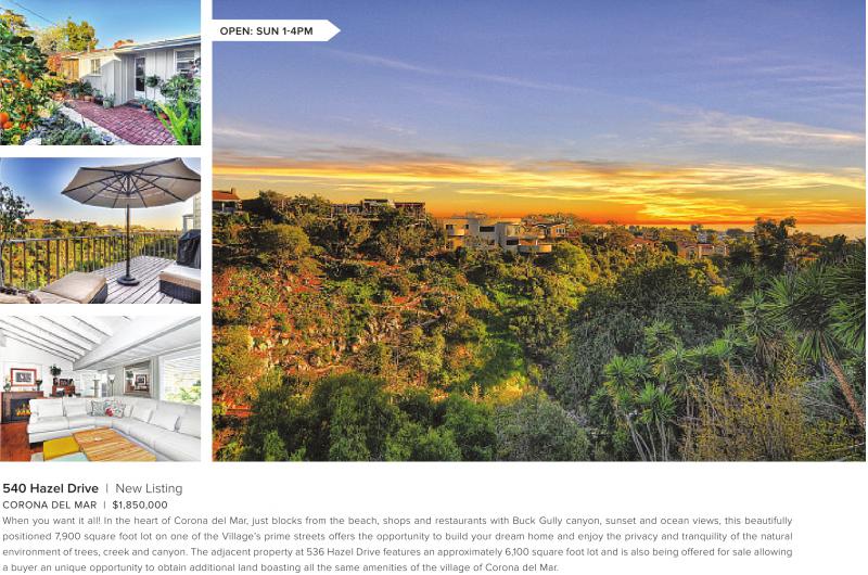 OPEN: SUN 1-4PM 540 Hazel Drive | New Listing CORONA DEL MAR | $1,850,000 When you want it all! In the heart of Corona del Mar, just blocks from the beach, shops and restaurants with Buck Gully canyon, sunset and ocean views, this beautifully positioned 7,900 square foot lot on one of the Village’s prime streets offers the opportunity to build your dream home and enjoy the privacy and tranquility of the natural environment of trees, creek and canyon. The adjacent property at 536 Hazel Drive features an approximately 6,100 square foot lot and is also being offered for sale allowing a buyer an unique opportunity to obtain additional land boasting all the same amenities of the village of Corona del Mar. See also