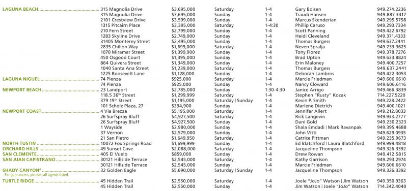 LAGUNA BEACH................................................ 315 Magnolia Drive $3,695,000 Saturday 1-4 Gary Boisen 949.274.2236 315 Magnolia Drive $3,695,000 Sunday 1-4 Traudi Hansen 949.887.3417 2101 Crestview Drive $3,599,000 Sunday 1-4 Marcus Skenderian 949.295.5758 1315 Pitcairn Place $3,395,000 Saturday 1-4:30 Phillip Caruso 949.293.7334 210 Fern Street $2,799,000 Sunday 1-4 Scott Panning 949.422.6792 1283 Skyline Drive $2,749,000 Sunday 1-4 Heidi Cleveland 949.371.4333 31405 Monterey Street $2,495,000 Sunday 1-4 Thomas Burgess 949.637.2441 2835 Chillon Way $1,699,000 Saturday 1-4 Neven Spralja 949.233.3625 1070 Miramar Street $1,399,900 Sunday 1-4 Tony Florez 949.378.7276 450 Osgood Court $1,395,000 Sunday 1-4 Brad Upton 949.633.8824 864 Quivera Street $1,349,000 Sunday 1-4 Erin Maloney 949.400.7257 1040 Santa Ana Street $1,239,000 Saturday 1-4 Thomas Burgess 949.637.2441 1225 Roosevelt Lane $1,128,000 Sunday 1-4 Deborah Lambros 949.422.3053 LAGUNA NIGUEL.............................................. 74 Pienza $925,000 Saturday 1-4 Marcie Friedman 949.606.6610 74 Pienza $925,000 Sunday 1-4 Nancy Cloward 949.606.6116 NEWPORT BEACH............................................. 23 Landport $2,785,000 Sunday 1:30-4:30 Janice Arrigo 949.466.3839 118.5 36 th Street $1,299,999 Saturday 1-4 Stephen “Rusty” Kozak 714.227.5220 379 19 th Street $1,195,000 Saturday | Sunday 1-4 Kevin P. Smith 949.228.2422 101 Scholz Plaza, 27 $394,900 Sunday 1-4 Marlene Dietrich 949.400.1021 NEWPORT COAST............................................. 4 Via Brezza $5,195,000 Saturday 1-4 Jennifer Allert 949.212.8033 26 Surfspray Bluff $4,927,500 Saturday 1-4 Rick Langevin 949.933.2777 26 Surfspray Bluff $4,927,500 Sunday 1-4 Dani Gold 949.230.2323 1 Wayside $2,980,000 Sunday 1-4 Shala Emdadi | Mark Ravanpak 949.395.4688 37 Vernon $2,579,000 Sunday 1-4 John Vitti 949.629.0935 21 San Pietro $1,649,950 Saturday 1-4 Catrice Pittman 949.235.9673 NORTH TUSTIN ................................................. 10072 Fox Springs Road $1,699,999 Sunday 1-4 Ed Blatchford | Laura Blatchford 949.999.4818 ORCHARD HILLS ............................................... 49 Sunset Cove $2,088,000 Saturday 1-4 Jacqueline Thompson 949.326.3392 SAN CLEMENTE................................................. 405 El Vuelo $859,000 Sunday 1-4 Drew Rowan 949.412.5815 SAN JUAN CAPISTRANO.................................. 30121 Hillside Terrace $2,545,000 Saturday 1-4 Kathy Garrison 949.293.2974 30121 Hillside Terrace $2,545,000 Sunday 1-4 Marcie Friedman 949.606.6610 SHADY CANYON ® ............................................. 32 Golden Eagle $5,690,000 Saturday | Sunday 1-4 Jacqueline Thompson 949.326.3392 -For gate access,pleasecallagentslisted. TURTLE RIDGE................................................... 45 Hidden Trail $2,550,000 Saturday 1-4 Joele “JoJo” Watson | Jim Watson 949.350.9363 45 Hidden Trail $2,550,000 Sunday 1-4 Jim Watson | Joele “JoJo” Watson 714.342.4040