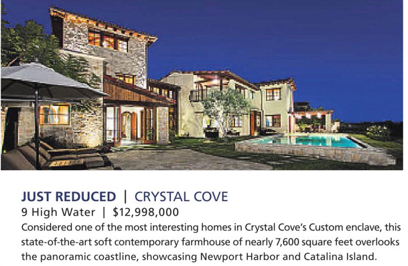 JUST REDUCED | CRYSTAL COVE 9 High Water | $12,998,000 Considered one of themostinteresting homesinCrystal Cove’s Custom enclave, this state-of-the-artsoftcontemporaryfarmhouse of nearly 7,600squarefeetoverlooks the panoramic coastline, showcasing Newport Harbor and Catalina Island.