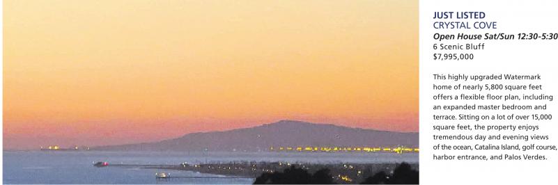 JUST LISTED CRYSTAL COVE Open House Sat/Sun 12:30-5:30 6 Scenic Bluff $7,995,000 This highly upgraded Watermark home of nearly 5,800 square feet offers a flexible floor plan, including an expanded master bedroom and terrace. Sitting on a lot of over 15,000 square feet, the property enjoys tremendous day and evening views of theocean, Catalina Island,golfcourse, harbor entrance, and Palos Verdes. See also