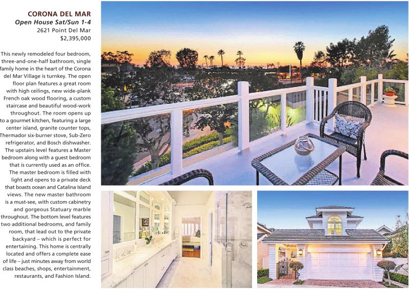 CORONA DEL MAR Open House Sat/Sun 1-4 2621 Point Del Mar $2,395,000 This newly remodeled four bedroom, three-and-one-half bathroom, single family home in the heart of the Corona del Mar Village is turnkey. The open floor plan features a great room with high ceilings, new wide-plank French oak wood flooring, a custom staircase and beautiful wood-work throughout. The room opens up to a gourmet kitchen, featuring a large center island, granite counter tops, Thermador six-burner stove, Sub-Zero refrigerator, and Bosch dishwasher. The upstairs level features a Master bedroom along with a guest bedroom that is currently used as an office. The master bedroom is filled with light and opens to a private deck that boasts ocean and Catalina Island views. The new master bathroom is a must-see, with custom cabinetry and gorgeous Statuary marble throughout. The bottom level features two additional bedrooms, and family room, that lead out to the private backyard – which is perfect for entertaining. This home is centrally located and offers a complete ease of life – just minutes away from world class beaches, shops, entertainment, restaurants, and Fashion Island. See also