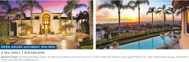open house saturday 1pm-5pm 5 sea shell | $10,980,000 Newport Coast: Stunning panoramic ocean, city lights and Catalina views from this over 10,000 square foot estate in guard-gated Pelican Hill. Large subterranean garage, entertainer’s dream yard with pool, barbecue, etc.
