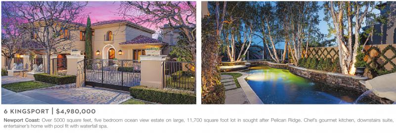 6 kingsport | $4,980,000 Newport Coast: Over 5000 square feet, five bedroom ocean view estate on large, 11,700 square foot lot in sought after Pelican Ridge. Chef’s gourmet kitchen, downstairs suite, entertainer’s home with pool fit with waterfall spa.