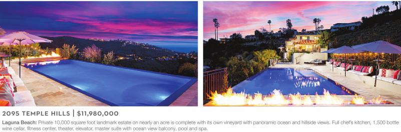 2095 temple hills | $11,980,000 Laguna Beach: Private 10,000 square foot landmark estate on nearly an acre is complete with its own vineyard with panoramic ocean and hillside views. Full chef’s kitchen, 1,500 bottle wine cellar, fitness center, theater, elevator, master suite with ocean view balcony, pool and spa.