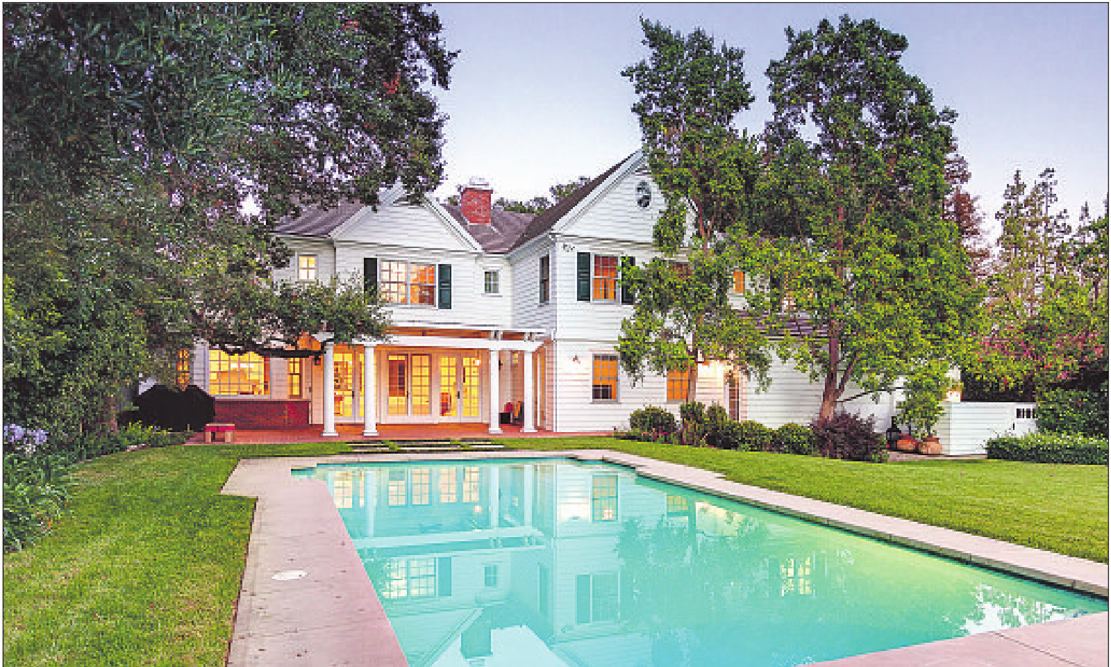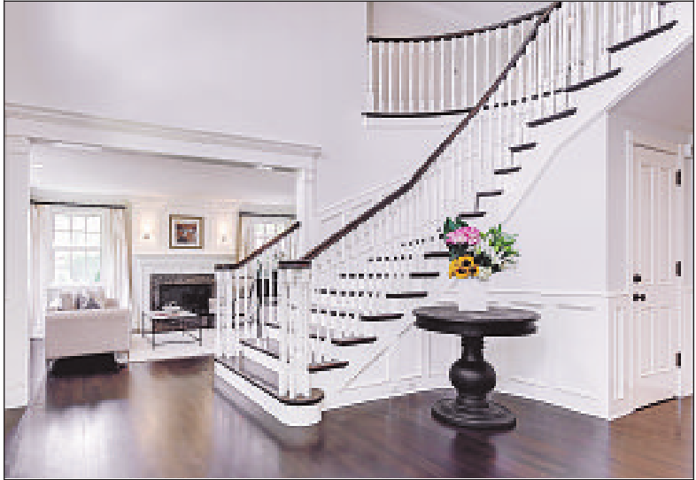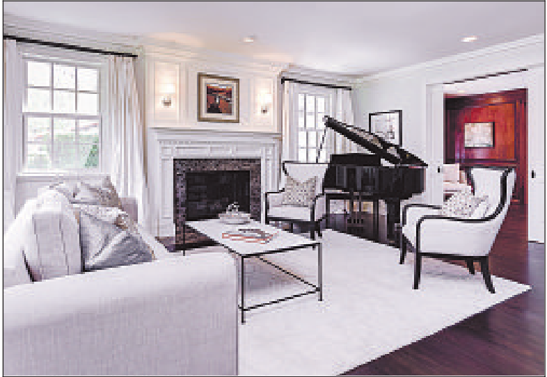 Aliving room with a fireplace, a formal dining room, a wood-paneled library, an office, five bedrooms and six updated bathrooms are within the white- and graywalled 5,563 square feet of living space. The kitchen features an eat-at island, a breakfast area, a butler’s pantry and two dishwashers. The family room opens to a brick-covered patio.