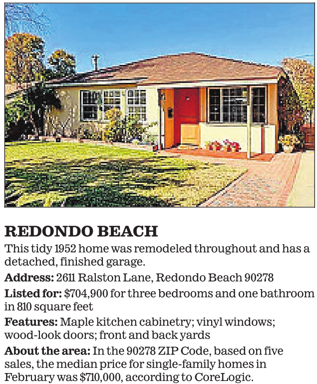 REDONDO BEACH This tidy 1952 home was remodeled throughout and has a detached, finished garage. Address: 2611 Ralston Lane, Redondo Beach 90278 Listed for: $704,900 for three bedrooms and one bathroom in 810 square feet Features: Maple kitchen cabinetry; vinyl windows; wood-look doors; front and back yards About the area: In the 90278 ZIP Code, based on five sales, the median price for single-family homes in February was $710,000, according to CoreLogic.