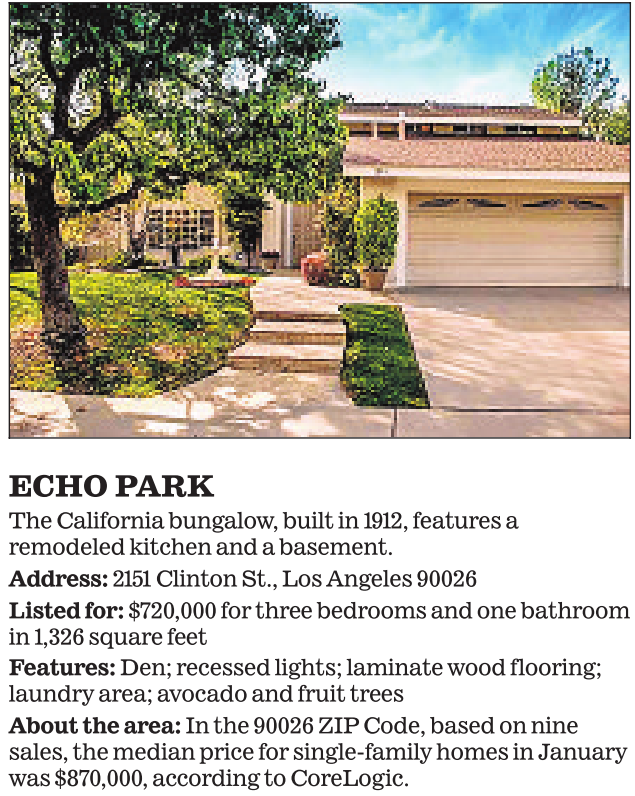 ECHO PARK The California bungalow, built in 1912, features a remodeled kitchen and a basement. Address: 2151Clinton St., Los Angeles 90026 Listed for: $720,000 for three bedrooms and one bathroom in 1,326 square feet Features: Den; recessed lights; laminate wood flooring; laundry area; avocado and fruit trees About the area: In the 90026 ZIP Code, based on nine sales, the median price for single-family homes in January was $870,000, according to CoreLogic.