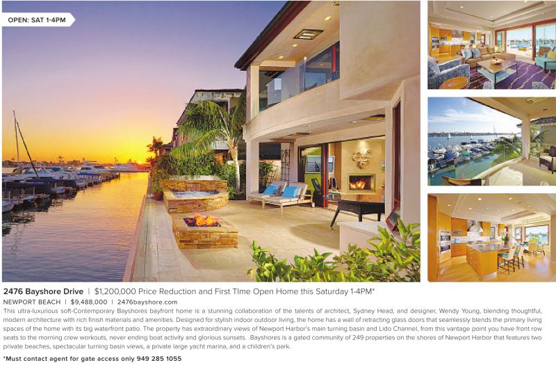 OPEN: SAT 1-4PM 2476 Bayshore Drive | $1,200,000 Price Reduction and First TIme Open Home this Saturday 1-4PM* NEWPORT BEACH | $9,488,000 | 2476bayshore.com This ultra-luxurious soft-Contemporary Bayshores bayfront home is a stunning collaboration of the talents of architect, Sydney Head, and designer, Wendy Young, blending thoughtful, modern architecture with rich finish materials and amenities. Designed for stylish indoor outdoor living, the home has a wall of retracting glass doors that seamlessly blends the primary living spaces of the home with its big waterfront patio. The property has extraordinary views of Newport Harbor’s main turning basin and Lido Channel, from this vantage point you have front row seats to the morning crew workouts, never ending boat activity and glorious sunsets. Bayshores is a gated community of 249 properties on the shores of Newport Harbor that features two private beaches, spectacular turning basin views, a private large yacht marina, and a children’s park. *Must contact agent for gate access only 949 285 1055 See also