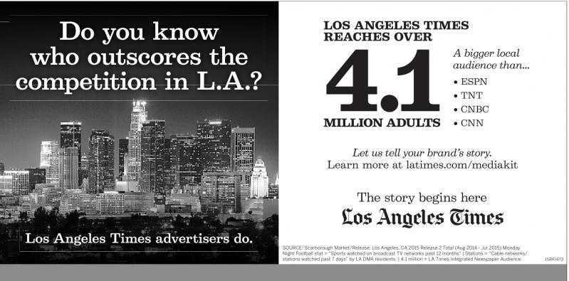 Do you know who outscores the competition in L.A.? Los Angeles Times advertisers do. LOS ANGELES TIMES REACHES OVER 4.1 MILLION ADULTS A bigger local audience than... • ESPN • TNT • CNBC • CNN Let us tell your brand’s story. Learn more at latimes.com/mediakit SOURCE: Scarborough Market/Release: Los Angeles, CA 2015 Release 2 Total (Aug 2014 - Jul 2015) Monday Night Football stat = “Sports watched on broadcast TV networks past 12 months” | Stations = “Cable networks/ stations watched past 7 days” by LA DMA residents. | 4.1 million = LA Times Integrated Newspaper Audience. 15BR1672