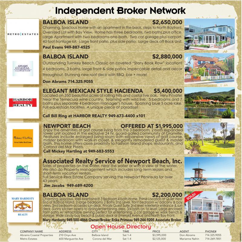 COMPANY NAME ADDRESS CITY TIME PRICE AGENT PHONE# Abrams Coastal Properties 210 Onyx Ave Balboa Island Sat 1-4 $3,595,000 Don Abrams 714.325.9055 Metro Estates 600 Marguerite Ave Corona del Mar Sat 1-4 $2,125,000 Marianne Nahin 714-269-7851