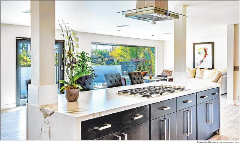 AFTER: Gone are walls separating the kitchen, dining and living areas; the interior is now one elongated open-plan home. The modern chef’s kitchen has Miele and Sub-Zero appliances, plus a 330-bottle floorto-ceiling wine case.