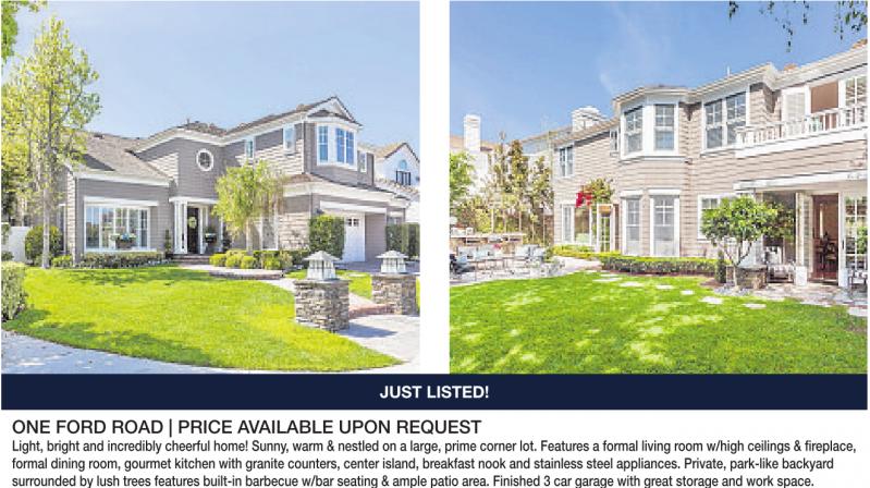 JUST LISTED! ONE FORD ROAD | PRICE AVAILABLE UPON REQUEST Light, bright and incredibly cheerful home! Sunny, warm &nestled on alarge, prime corner lot. Features aformal living room w/high ceilings &fireplace, formal dining room, gourmet kitchen with granite counters, center island, breakfast nook and stainless steel appliances. Private, park-like backyard surrounded by lush trees features built-in barbecue w/bar seating &le patio area. Finished 3car garage with great storage and work space.
