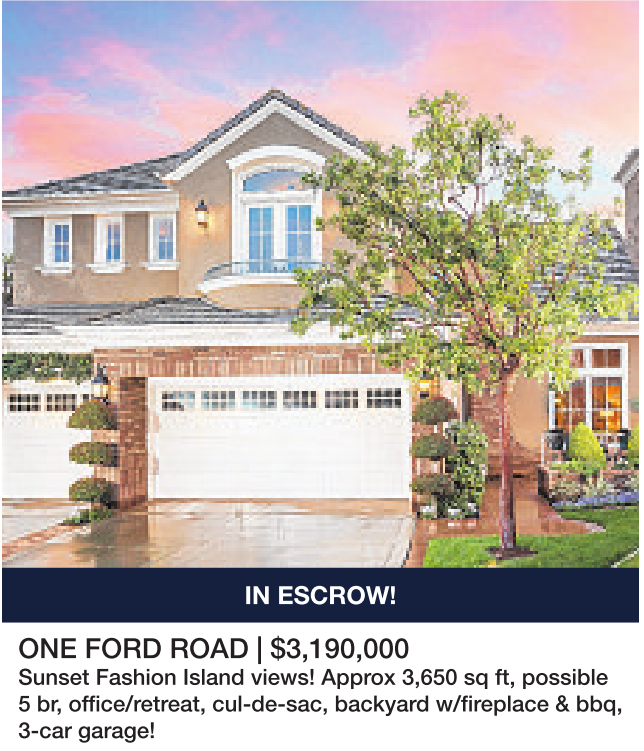 ONE FORD ROAD | $3,190,000 Sunset Fashion Island views! Approx 3,650 sq ft, possible 5 br, office/retreat, cul-de-sac, backyard w/fireplace & bbq, 3-car garage!