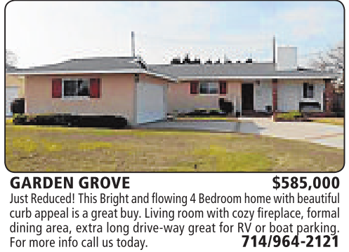 GARDEN GROVE $585,000 Just Reduced! This Bright andflowing4Bedroomhomewithbeautiful curb appeal is agreat buy. Living room with cozy fireplace,formal dining area, extra long drive-way great for RV or boat parking. Formoreinfocallustoday. 714/964-2121
