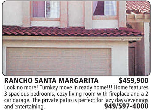 RANCHO SANTA MARGARITA $459,900 Look no more!Turnkey move in readyhome!!! Home features 3spacious bedrooms, cozy living room with fireplace and a2 cargarage. Theprivatepatio is perfectfor lazy days/evenings and entertaining. 949/597-4000