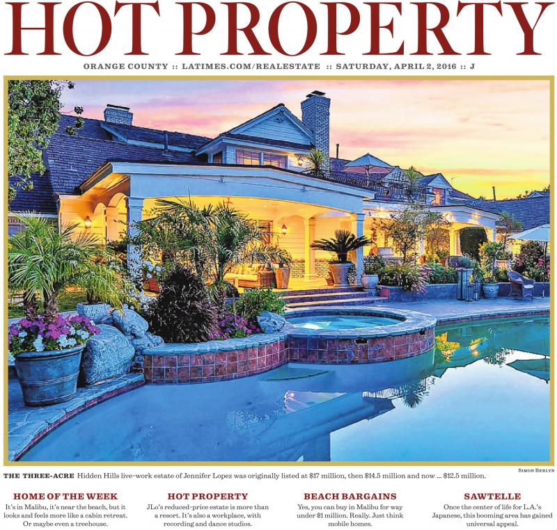 HOT PROPERT Y ORANGE COUNTY :: LATIMES.COM/REALESTATE :: SATURDAY, APRIL 2, 2016 :: J THE THREE-ACRE Hidden Hills live-work estate of Jennifer Lopez was originally listed at $17 million, then $14.5 million and now ... $12.5 million. Simon Berlyn HOME OF THE WEEK It’s in Malibu, it’s near the beach, but it looks and feels more like a cabin retreat. Or maybe even a treehouse. HOT PROPERTY JLo’s reduced-price estate is more than a resort. It’s also a workplace, with recording and dance studios. BEACH BARGAINS Yes, you can buy in Malibu for way under $1 million. Really. Just think mobile homes. SAWTELLE Once the center of life for L.A.’s Japanese, this booming area has gained universal appeal.