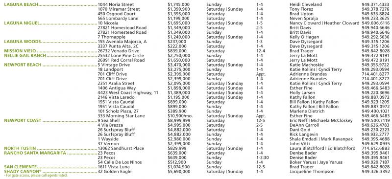 LAGUNA BEACH...........................................1044 Noria Street $1,745,000 Sunday 1-4 Heidi Cleveland 949.371.4333 1070 Miramar Street $1,399,900 Saturday | Sunday 1-4 Tony Florez 949.378.7276 450 Osgood Court $1,395,000 Saturday 1-4 Brad Upton 949.633.8824 565 Lombardy Lane $1,199,000 Saturday 1-4 Neven Spralja 949.233.3625 LAGUNA NIGUEL..........................................10 Nicosia $1,695,000 Saturday | Sunday 1-5 Nancy Cloward | Heather Cloward 949.606.6116 27821 Homestead Road $1,349,000 Saturday 2-5 Britt Davis 949.940.6646 27821 Homestead Road $1,349,000 Sunday 1-4 Britt Davis 949.940.6646 7 Thornapple $1,249,000 Saturday | Sunday 1-4 Kelly O'Hagan 949.292.5636 LAGUNA WOODS.........................................155 Avenida Majorca, A $237,000 Sunday 1-3 Dave Dyssegard 949.315.1206 3337 Punta Alta, 2C $222,000 Saturday 1-4 Dave Dyssegard 949.315.1206 MISSION VIEJO ............................................26732 Venado Drive $839,000 Saturday 12-4 Brad Trager 949.842.8028 NELLIE GAIL RANCH.....................................25532 Lone Pine Circle $2,750,000 Sunday 1-4 Jerry La Mott 949.472.9191 26091 Red Corral Road $1,650,000 Saturday 1-4 Jerry La Mott 949.472.9191 NEWPORT BEACH ........................................5 Vintage Drive $3,470,000 Saturday | Sunday 1-4 Katie Machoskie 949.355.9722 18 Landport $3,275,000 Sunday 1-4 Katie Rollins | Cyndi Terry 949.293.0594 701 Cliff Drive $2,399,000 Saturday Appt. Adrienne Brandes 714.401.8277 701 Cliff Drive $2,399,000 Sunday 1-4 Adrienne Brandes 714.401.8277 2351 Aralia Street $2,095,000 Saturday | Sunday 1-4 Katie Rollins | Cyndi Terry 949.293.0594 1406 Antigua Way $1,898,000 Saturday | Sunday 1-4 Esther Fine 949.466.6483 4423 West Coast Highway, 11 $1,389,000 Saturday | Sunday 1-4 Holly Larsen 949.220.3696 2146 Vista Laredo $1,195,000 Saturday | Sunday 1-4 Kathy Fallon 949.887.0972 1951 Vista Caudal $899,000 Saturday 1-4 Bill Fallon | Kathy Fallon 949.923.1205 1951 Vista Caudal $899,000 Sunday 1-4 Kathy Fallon | Bill Fallon 949.887.0972 101 Scholz Plaza, 27 $389,900 Sunday 1-4 Marlene Dietrich 949.400.1021 333 Morning Star Lane $10,900/mo. Saturday | Sunday Appt. Esther Fine 949.466.6483 NEWPORT COAST ........................................9 Sea Shell $8,999,999 Saturday 12-5 Eric Neff | Michaela McCloskey 949.500.7119 4 Via Brezza $4,995,000 Saturday 2-5 DeAnn Carroll 949.636.4783 26 Surfspray Bluff $4,882,000 Saturday 1-4 Dani Gold 949.230.2323 26 Surfspray Bluff $4,882,000 Sunday 1-4 Rick Langevin 949.933.2777 1 Wayside $2,980,000 Sunday 1-4 Shala Emdadi | Mark Ravanpak 949.395.4688 37 Vernon $2,399,000 Sunday 1-4 John Vitti 949.629.0935 NORTH TUSTIN ............................................13062 Sandhurst Place $829,999 Saturday | Sunday 1-4 Laura Blatchford | Ed Blatchford 714.612.6883 RANCHO SANTA MARGARITA ......................23 Pecos $639,000 Saturday 1-4 Denise Bader 949.395.9461 23 Pecos $639,000 Sunday 1-3:30 Denise Bader 949.395.9461 54 Calle De Los Ninos $512,900 Sunday 1-4 Boker Yaruss | Jaye Yaruss 949.929.7187 SAN CLEMENTE............................................1611 Vista Luna $1,074,900 Sunday 12-5 Brad Trager 949.842.8028 SHADY CANYON ® ........................................32 Golden Eagle $5,690,000 Saturday | Sunday 1-4 Jacqueline Thompson 949.326.3392 -For gate access,pleasecallagentslisted.