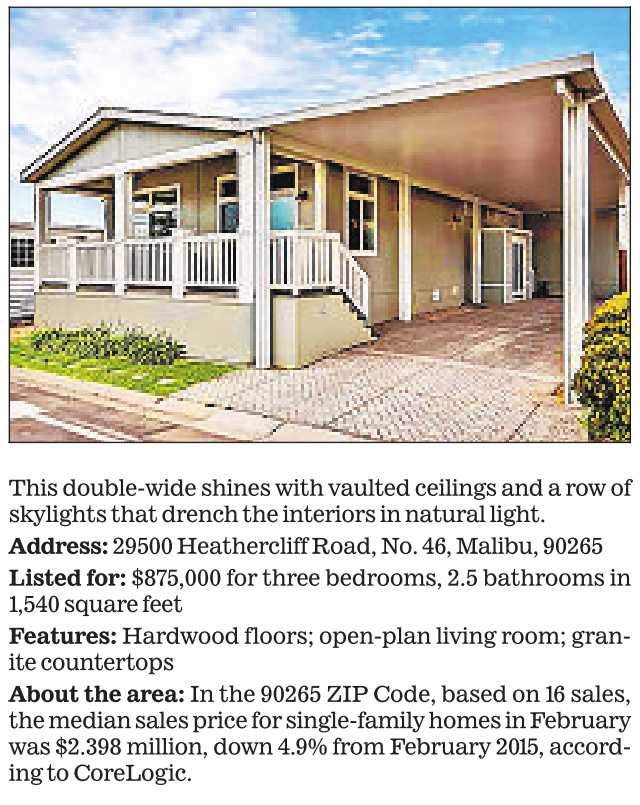 About the area: In the 90265 ZIP Code, based on 16 sales, the median sales price for single-family homes in February was $2.398 million, down 4.9% from February 2015, according to CoreLogic.