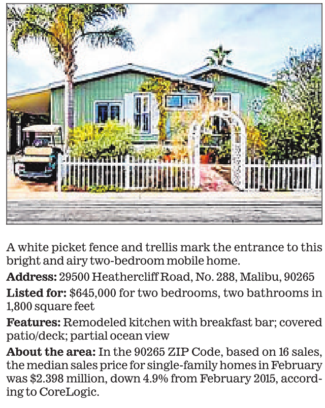 About the area: In the 90265 ZIP Code, based on 16 sales, the median sales price for single-family homes in February was $2.398 million, down 4.9% from February 2015, according to CoreLogic.