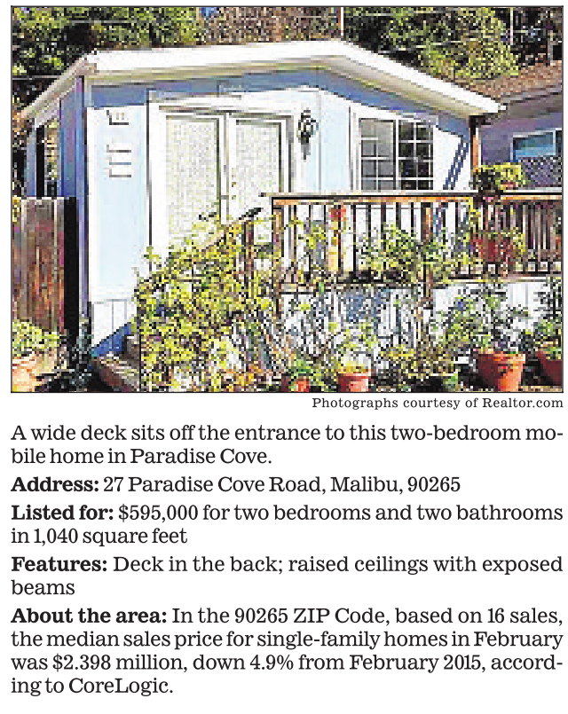 Address: 27 Paradise Cove Road, Malibu, 90265 Listed for: $595,000 for two bedrooms and two bathrooms in 1,040 square feet