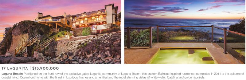 Laguna Beach: Positioned on the front row of the exclusive gated Lagunita community of Laguna Beach, this custom Balinese-inspired residence, completed in 2011 is the epitome of coastal living. Oceanfront home with the finest in luxurious finishes and amenities and the most stunning vistas of white water, Catalina and golden sunsets.