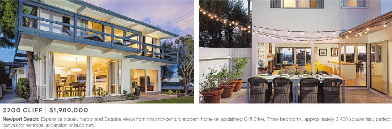 Newport Beach: Expansive ocean, harbor and Catalina views from this mid-century modern home on acclaimed Cliff Drive. Three bedrooms, approximately 2,400 square feet, perfect canvas for remodel, expansion or build new.