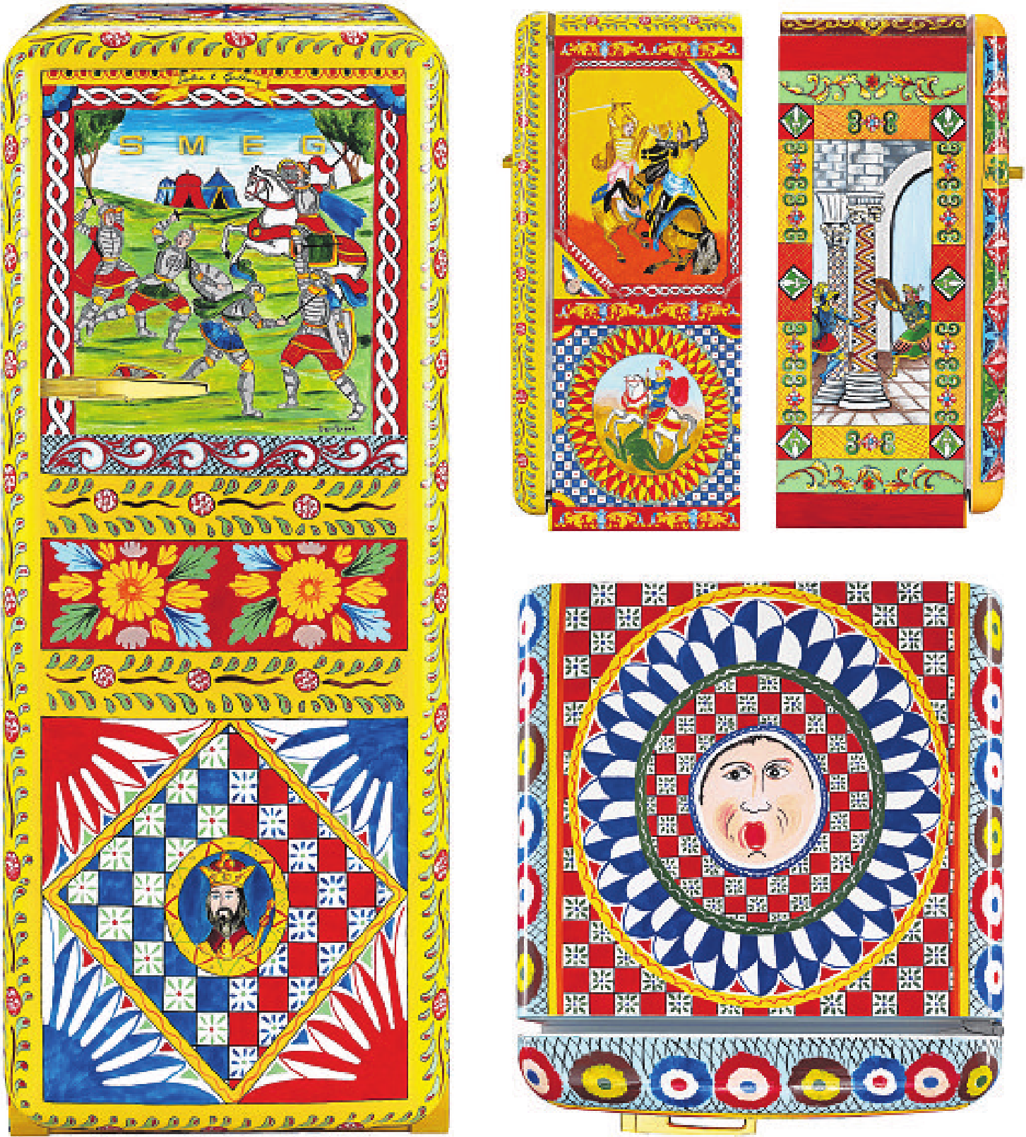 Using the iconic SMEG FAB28 refrigerator as their canvas, Sicilian artists were tapped by designers Domenico Dolce and Stefano Gabbana to create scenes and patterns inspired by elements of the country’s beloved marionette theater and the colorful, Gypsy-like decoration of traditional, Sicilian horse-pulled carts.