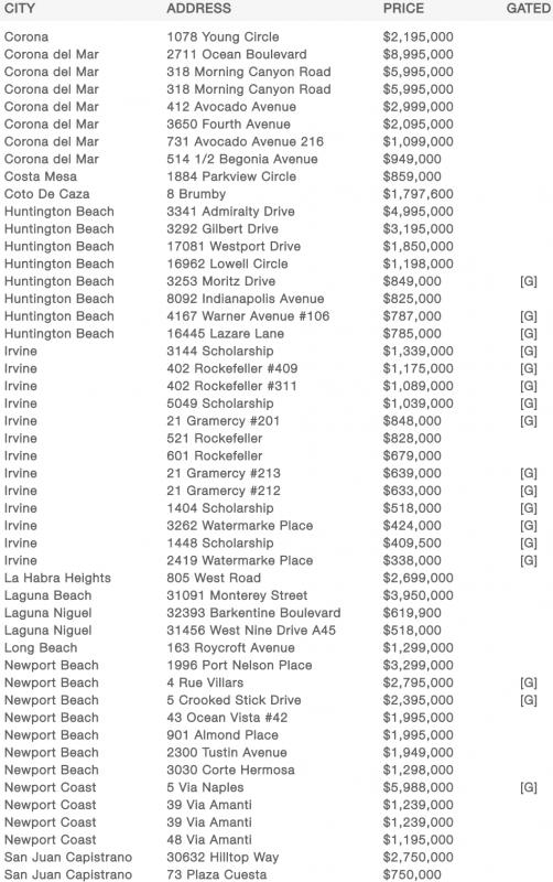 Corona 1078 Young Circle $2,195,000 Corona del Mar 2711 Ocean Boulevard $8,995,000 Corona del Mar 318 Morning Canyon Road $5,995,000 Corona del Mar 318 Morning Canyon Road $5,995,000 Corona del Mar 412 Avocado Avenue $2,999,000 Corona del Mar 3650 Fourth Avenue $2,095,000 Corona del Mar 731 Avocado Avenue 216 $1,099,000 Corona del Mar 514 1/2 Begonia Avenue $949,000 Costa Mesa 1884 Parkview Circle $859,000 Coto De Caza 8 Brumby $1,797,600 Huntington Beach 3341 Admiralty Drive $4,995,000 Huntington Beach 3292 Gilbert Drive $3,195,000 Huntington Beach 17081 Westport Drive $1,850,000 Huntington Beach 16962 Lowell Circle $1,198,000 Huntington Beach 3253 Moritz Drive $849,000 [G] Huntington Beach 8092 Indianapolis Avenue $825,000 Huntington Beach 4167 Warner Avenue #106 $787,000 [G] Huntington Beach 16445 Lazare Lane $785,000 [G] Irvine 3144 Scholarship $1,339,000 [G] Irvine 402 Rockefeller #409 $1,175,000 [G] Irvine 402 Rockefeller #311 $1,089,000 [G] Irvine 5049 Scholarship $1,039,000 [G] Irvine 21 Gramercy #201 $848,000 [G] Irvine 521 Rockefeller $828,000 Irvine 601 Rockefeller $679,000 Irvine 21 Gramercy #213 $639,000 [G] Irvine 21 Gramercy #212 $633,000 [G] Irvine 1404 Scholarship $518,000 [G] Irvine 3262 Watermarke Place $424,000 [G] Irvine 1448 Scholarship $409,500 [G] Irvine 2419 Watermarke Place $338,000 [G] La Habra Heights 805 West Road $2,699,000 Laguna Beach 31091 Monterey Street $3,950,000 Laguna Niguel 32393 Barkentine Boulevard $619,900 Laguna Niguel 31456 West Nine Drive A45 $518,000 Long Beach 163 Roycroft Avenue $1,299,000 Newport Beach 1996 Port Nelson Place $3,299,000 Newport Beach 4 Rue Villars $2,795,000 [G] Newport Beach 5 Crooked Stick Drive $2,395,000 [G] Newport Beach 43 Ocean Vista #42 $1,995,000 Newport Beach 901 Almond Place $1,995,000 Newport Beach 2300 Tustin Avenue $1,949,000 Newport Beach 3030 Corte Hermosa $1,298,000 Newport Coast 5 Via Naples $5,988,000 [G] Newport Coast 39 Via Amanti $1,239,000 Newport Coast 39 Via Amanti $1,239,000 Newport Coast 48 Via Amanti $1,195,000 San Juan Capistrano 30632 Hilltop Way $2,750,000 San Juan Capistrano 73 Plaza Cuesta $750,000