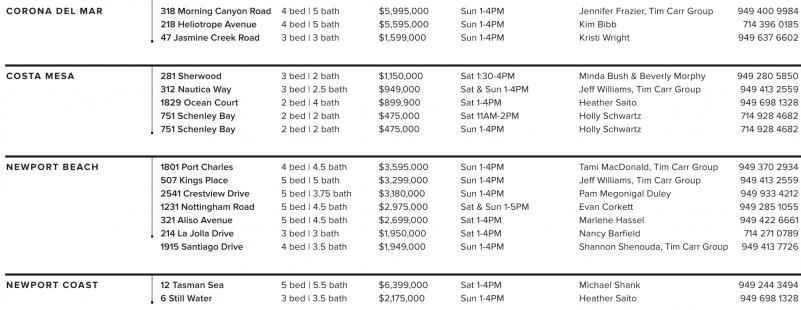 CORONA DEL MAR 318 Morning Canyon Road 4 bed | 5 bath $5,995,000 Sun 1-4PM Jennifer Frazier, Tim Carr Group 949 400 9984 218 Heliotrope Avenue 4 bed | 5 bath $5,595,000 Sun 1-4PM Kim Bibb 714 396 0185 47 Jasmine Creek Road 3 bed | 3 bath $1,599,000 Sun 1-4PM Kristi Wright 949 637 6602 COSTA MESA 281 Sherwood 3 bed | 2 bath $1,150,000 Sat 1:30-4PM Minda Bush & Beverly Morphy 949 280 5850 312 Nautica Way 3 bed | 2.5 bath $949,000 Sat & Sun 1-4PM Jeff Williams, Tim Carr Group 949 413 2559 1829 Ocean Court 2 bed | 4 bath $899,900 Sat 1-4PM Heather Saito 949 698 1328 751 Schenley Bay 2 bed | 2 bath $475,000 Sat 11AM-2PM Holly Schwartz 714 928 4682 751 Schenley Bay 2 bed | 2 bath $475,000 Sun 1-4PM Holly Schwartz 714 928 4682 NEWPORT BEACH 1801 Port Charles 4 bed | 4.5 bath $3,595,000 Sun 1-4PM Tami MacDonald, Tim Carr Group 949 370 2934 507 Kings Place 5 bed | 5 bath $3,299,000 Sun 1-4PM Jeff Williams, Tim Carr Group 949 413 2559 2541 Crestview Drive 5 bed | 3.75 bath $3,180,000 Sun 1-4PM Pam Megonigal Duley 949 933 4212 1231 Nottingham Road 5 bed | 4.5 bath $2,975,000 Sat & Sun 1-5PM Evan Corkett 949 285 1055 321 Aliso Avenue 5 bed | 4.5 bath $2,699,000 Sat 1-4PM Marlene Hassel 949 422 6661 214 La Jolla Drive 3 bed | 3 bath $1,950,000 Sat 1-4PM Nancy Barfield 714 271 0789 1915 Santiago Drive 4 bed | 3.5 bath $1,949,000 Sun 1-4PM Shannon Shenouda, Tim Carr Group 949 413 7726 NEWPORT COAST 12 Tasman Sea 5 bed | 5.5 bath $6,399,000 Sat 1-4PM Michael Shank 949 244 3494 6 Still Water 3 bed | 3.5 bath $2,175,000 Sun 1-4PM Heather Saito 949 698 1328