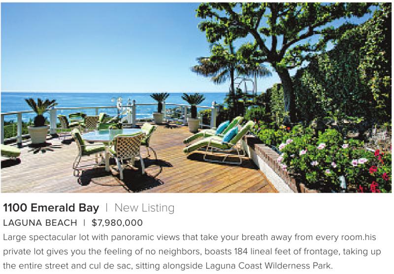 1100 Emerald Bay | New Listing LAGUNA BEACH | $7,980,000 Large spectacular lot with panoramic views that take your breath away from every room.his private lot gives you the feeling of no neighbors, boasts 184 lineal feet of frontage, taking up the entire street and cul de sac, sitting alongside Laguna Coast Wilderness Park.