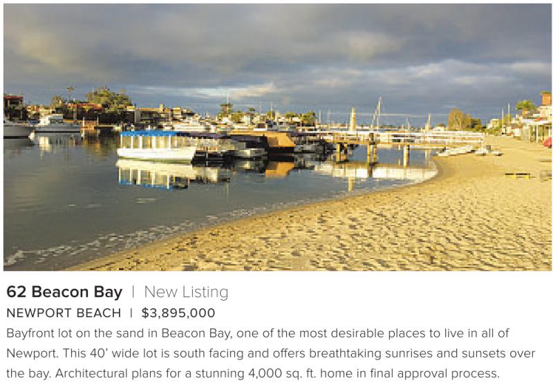 62 Beacon Bay | New Listing NEWPORT BEACH | $3,895,000 Bayfront lot on the sand in Beacon Bay, one of the most desirable places to live in all of Newport. This 40’ wide lot is south facing and offers breathtaking sunrises and sunsets over the bay. Architectural plans for a stunning 4,000 sq. ft. home in final approval process.