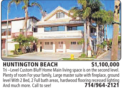 HUNTINGTON BEACH $1,100,000 Tri–LevelCustomBluff Home Main living spaceisonthe second level. Plentyofroom For your family,Large master suite with fireplace,ground levelWith2Bed,2Full bath areas, hardwood flooring recessedlighting Andmuch more.Calltosee! 714/964-2121