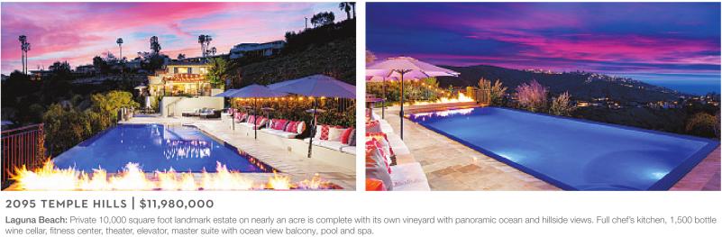 Laguna Beach: Private 10,000 square foot landmark estate on nearly an acre is complete with its own vineyard with panoramic ocean and hillside views. Full chef’s kitchen, 1,500 bottle wine cellar, fitness center, theater, elevator, master suite with ocean view balcony, pool and spa.