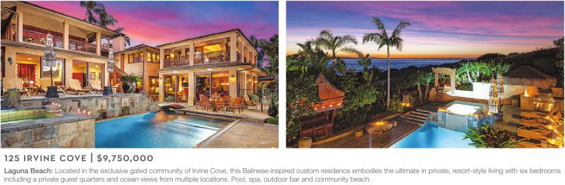 Laguna Beach: Located in the exclusive gated community of Irvine Cove, this Balinese-inspired custom residence embodies the ultimate in private, resort-style living with six bedrooms including a private guest quarters and ocean views from multiple locations. Pool, spa, outdoor bar and community beach.