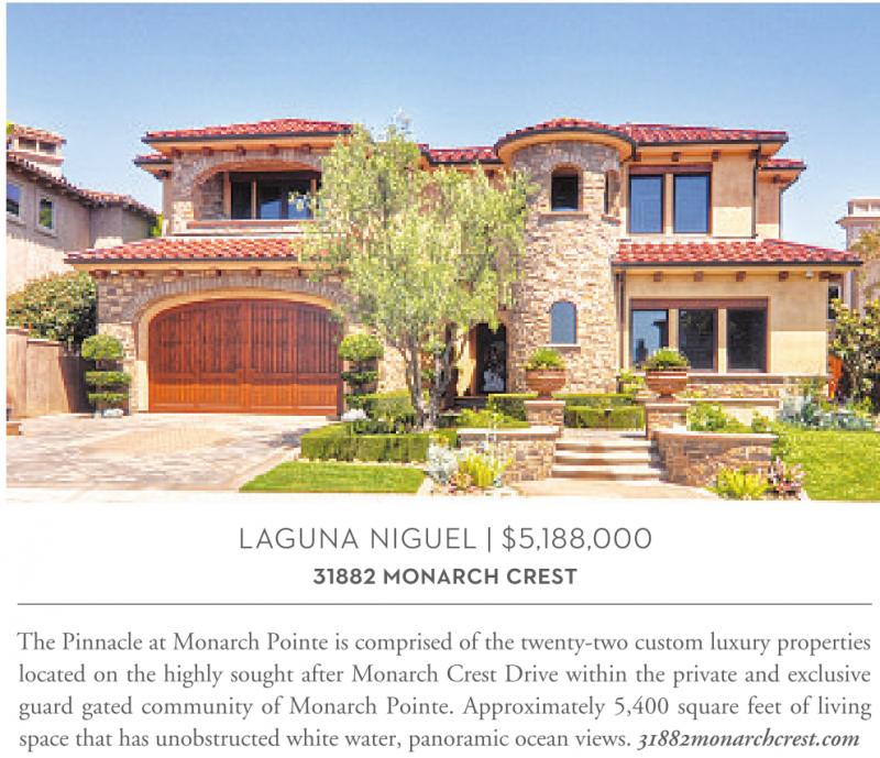 LAGUNA NIGUEL | $5,188,000 31882 monarch crest The Pinnacle at Monarch Pointe is comprised of the twenty-two custom luxury properties located on the highly sought after Monarch Crest Drive within the private and exclusive guard gated community of Monarch Pointe. Approximately 5,400 square feet of living space that has unobstructed white water, panoramic ocean views. 31882monarchcrest.com