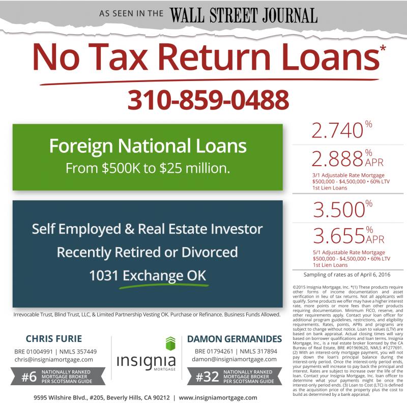 ©2015 Insignia Mortgage, Inc. *(1) These products require other forms of income documentation and asset verification in lieu of tax returns. Not all applicants will qualify. Some products we offer may have ahigher interest rate, more points or more fees than other products requiring documentation. Minimum FICO, reserve, and other requirements apply. Contact your loan officer for additional program guidelines, restrictions, and eligibility requirements. Rates, points, APRs and programs are subject to change without notice. Loan to values (LTV) are based on bank appraisal. Actual closing times will vary based on borrower qualifications and loan terms. Insignia Mortgage, Inc., is a real estate broker licensed by the CA Bureau of Real Estate, BRE #01969620, NMLS #1277691. (2) With an interest-only mortgage payment, you will not pay down the loan's principal balance during the interest-only period. Once the interest-only period ends, your payments will increase to pay back the principal and interest. Rates are subject to increase over the life of the loan. Contact your Insignia Mortgage, Inc. loan officer to determine what your payments might be once the interest-only period ends. (3) Loan to Cost (LTC) is defined as the acquisition price of the property plus the cost to build as determined by abank appraisal.