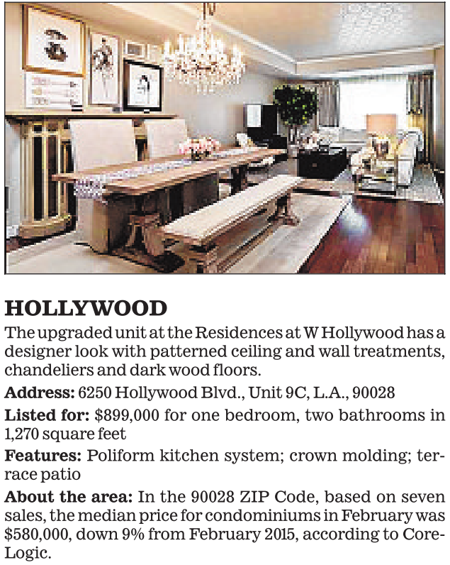 About the area: In the 90028 ZIP Code, based on seven sales, the median price for condominiums in February was $580,000, down 9% from February 2015, according to Core- Logic.