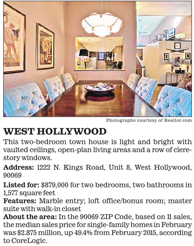 Listed for: $879,000 for two bedrooms, two bathrooms in 1,577 square feet Features: Marble entry; loft office/bonus room; master suite with walk-in closet About the area: In the 90069 ZIP Code, based on 11 sales, the median sales price for single-family homes in February was $2.875 million, up 49.4% from February 2015, according to CoreLogic.