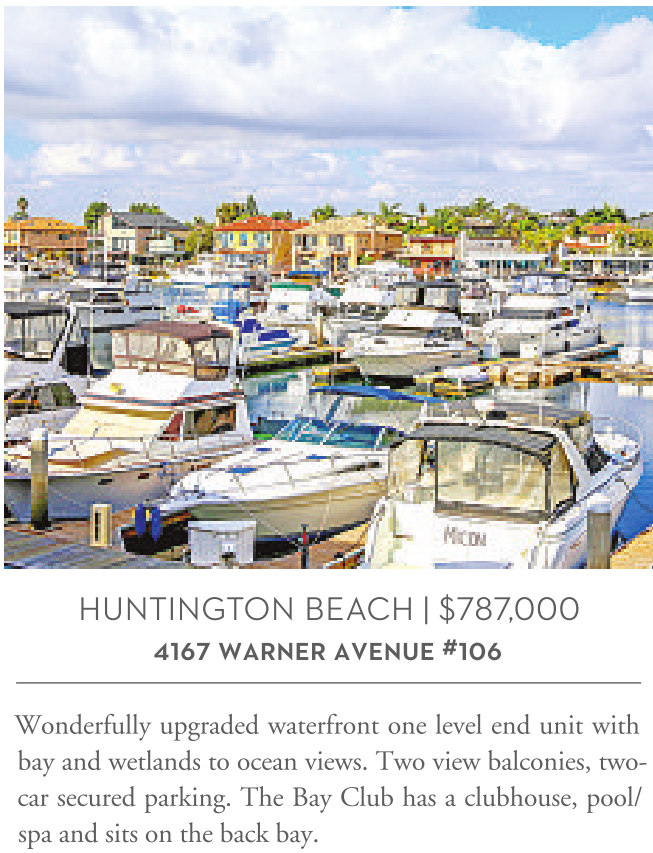 HUNTINGTON BEACH | $787,000 4167 warner avenue #106 Wonderfully upgraded waterfront one level end unit with bay and wetlands to ocean views. Two view balconies, twocar secured parking. The Bay Club has a clubhouse, pool/ spa and sits on the back bay.
