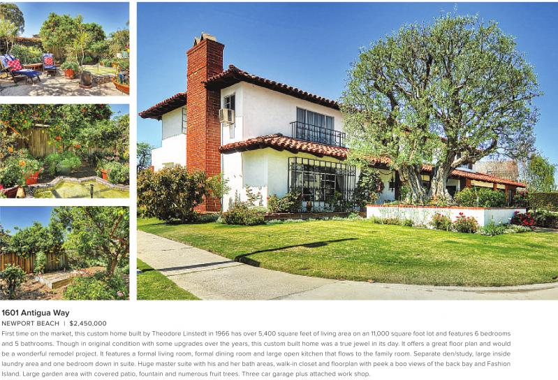 1601 Antigua Way NEWPORT BEACH | $2,450,000 First time on the market, this custom home built by Theodore Linstedt in 1966 has over 5,400 square feet of living area on an 11,000 square foot lot and features 6 bedrooms and 5 bathrooms. Though in original condition with some upgrades over the years, this custom built home was a true jewel in its day. It offers a great floor plan and would be a wonderful remodel project. It features a formal living room, formal dining room and large open kitchen that flows to the family room. Separate den/study, large inside laundry area and one bedroom down in suite. Huge master suite with his and her bath areas, walk-in closet and floorplan with peek a boo views of the back bay and Fashion Island. Large garden area with covered patio, fountain and numerous fruit trees. Three car garage plus attached work shop.