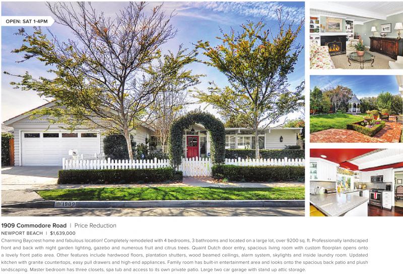 NEWPORT BEACH | $1,639,000 Charming Baycrest home and fabulous location! Completely remodeled with 4 bedrooms, 3 bathrooms and located on a large lot, over 9200 sq. ft. Professionally landscaped front and back with night garden lighting, gazebo and numerous fruit and citrus trees. Quaint Dutch door entry, spacious living room with custom floorplan opens onto a lovely front patio area. Other features include hardwood floors, plantation shutters, wood beamed ceilings, alarm system, skylights and inside laundry room. Updated kitchen with granite countertops, easy pull drawers and high-end appliances. Family room has built-in entertainment area and looks onto the spacious back patio and plush landscaping. Master bedroom has three closets, spa tub and access to its own private patio. Large two car garage with stand up attic storage.