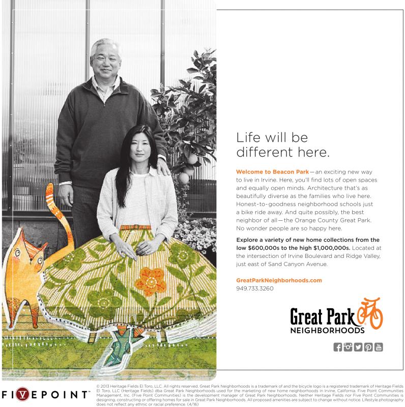 Life will be different here. Welcome to Beacon Park—an exciting new way to live in Irvine. Here, you’ll find lots of open spaces and equally open minds. Architecture that’s as beautifully diverse as the families who live here. Honest-to-goodness neighborhood schools just a bike ride away. And quite possibly, the best neighbor of all—the Orange County Great Park. No wonder people are so happy here. Explore a variety of new home collections from the low $600,000s to the high $1,000,000s. Located at the intersection of Irvine Boulevard and Ridge Valley, just east of Sand Canyon Avenue. GreatParkNeighborhoods.com 949.733.3260 ©2013 Heritage Fields El Toro, LLC. All rights reserved. Great Park Neighborhoods is atrademark ofand the bicycle logo is aregistered trademark of Heritage Fields El Toro, LLC (Heritage Fields) dba Great Park Neighborhoods used for the marketing of new home neighborhoods in Irvine, California. Five Point Communities Management, Inc. (Five Point Communities) is the development manager of Great Park Neighborhoods. Neither Heritage Fields nor Five Point Communities is designing, constructing or offering homes forsale in GreatPark Neighborhoods. All proposed amenities aresubjecttochange withoutnotice. Lifestyle photography does not reflect any ethnic or racial preference. (4/16)