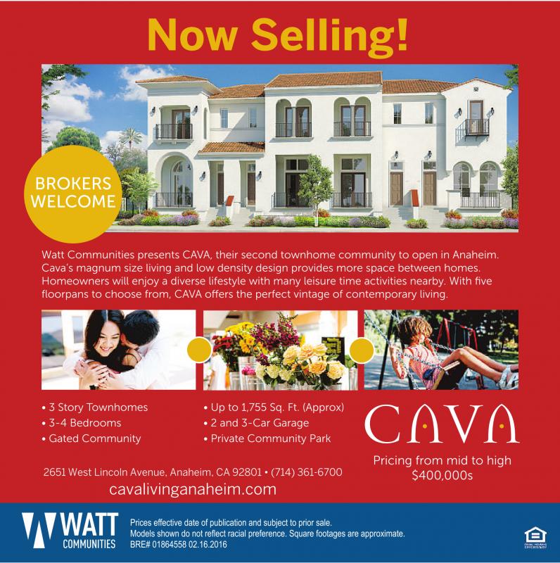 Now Selling! BROKERS WELCOME Watt Communities presents CAVA, their second townhome community to open in Anaheim. Cava’s magnum size living and low density design provides more space between homes. Homeowners will enjoy a diverse lifestyle with many leisure time activities nearby. With five floorpans to choose from, CAVA offers the perfect vintage of contemporary living. • 3 Story Townhomes • 3-4 Bedrooms • Gated Community • Up to 1,755 Sq. Ft. (Approx) • 2 and 3-Car Garage • Private Community Park 2651 West Lincoln Avenue, Anaheim, CA 92801 • (714) 361-6700 cavalivinganaheim.com Pricing from mid to high $400,000s Prices effective date of publication and subject to prior sale. Models shown do not reflect racial preference. Square footages are approximate. BRE# 01864558 02.16.2016