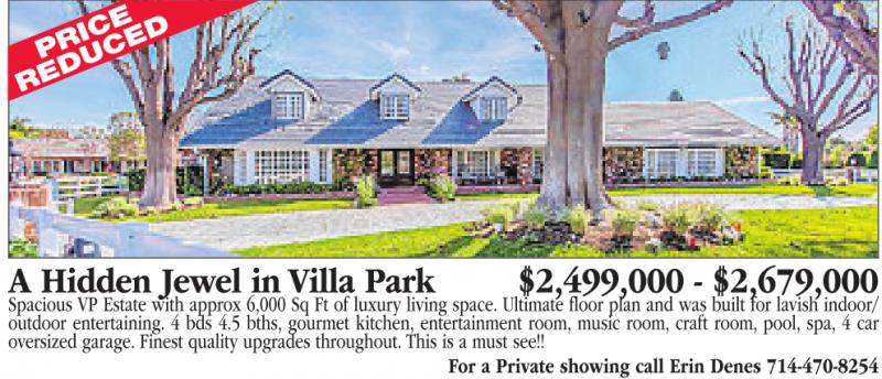 A Hidden Jewel in Villa Park $2,499,000 - $2,679,000 Spacious VP Estate with approx 6,000 Sq Ft of luxury living space. Ultimate floor plan and was built for lavish indoor/ outdoor entertaining. 4 bds 4.5 bths, gourmet kitchen, entertainment room, music room, craft room, pool, spa, 4 car oversized garage. Finest quality upgrades throughout. This is a must see!! For a Private showing call Erin Denes 714-470-8254