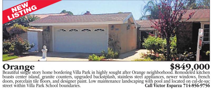 Beautiful single story home bordering Villa Park in highly sought after Orange neighborhood. Remodeled kitchen boasts center island, granite counters, upgraded backstplash, stainless steel appliances, newer windows, french doors, porcelain tile floors,and designer paint. Low maintenance landscaping with pool and located oncul-de-sac street within Villa Park School boundaries. Call Victor Esparza 714-856-9756
