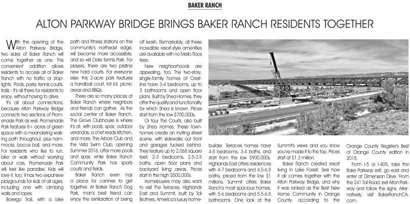 Baker Ranch created resort living in lake Forest. see how it all comes together with the Alton Parkway Bridge, and why it was ranked as the Best new home community in orange county, according to the