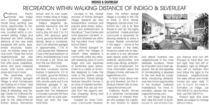 home opportunities to portola Springs® Village in irvine. Located within a convenient setting, indigo and Silverleaf are within walking distance of two new parks equipped with pools, spas, shade structures, barbecues, tot lot/play areas and club room. These new home neighborhoods are also close to 12 additional parks that offer pools, basketball, tennis and sand volleyball courts, club rooms, picnic areas and much more.
