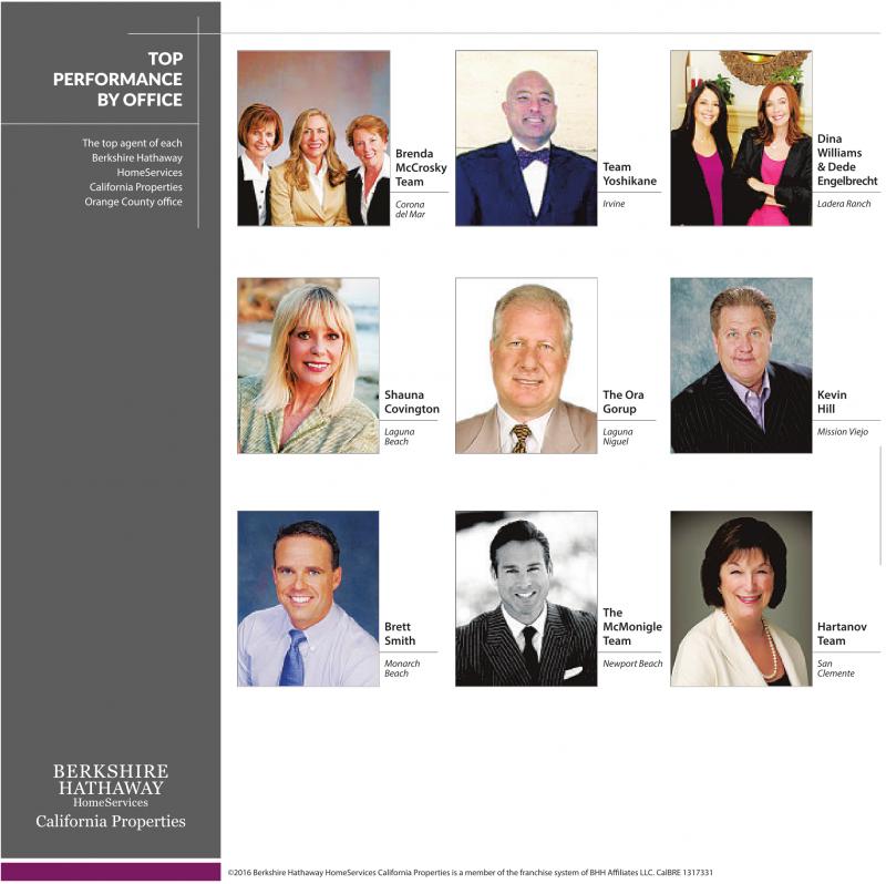 TOP PERFORMANCE BY OFFICE Thetop agentofeach BerkshireHathaway HomeServices California Properties Orange County office Brenda McCrosky Team Corona del Mar Team Yoshikane Irvine Dina Williams & Dede Engelbrecht LaderaRanch Shauna Covington The Ora Gorup Laguna Beach Laguna Niguel Brett Smith The McMonigle Team Monarch Beach NewportBeach ©2016 BerkshireHathawayHomeServices California Properties is amemberofthe franchise system of BHH AffiliatesLLC.CalBRE 1317331 Kevin Hill Mission Viejo Hartanov Team San Clemente