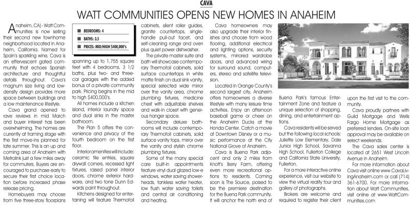 For more information about Cava visit online www.CavaLivingAnaheim.com or call (714) 361-6700. For more information about Watt Communities, visit online at www.WattCommunities.com