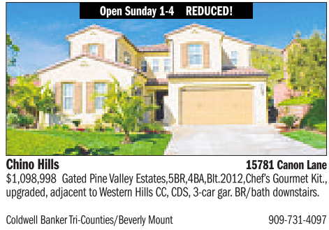 Chino Hills 15781 Canon Lane $1,098,998 Gated Pine Valley Estates,5BR,4BA,Blt.2012,Chef’s Gourmet Kit., upgraded, adjacent to Western Hills CC, CDS, 3-car gar.BR/bath downstairs.